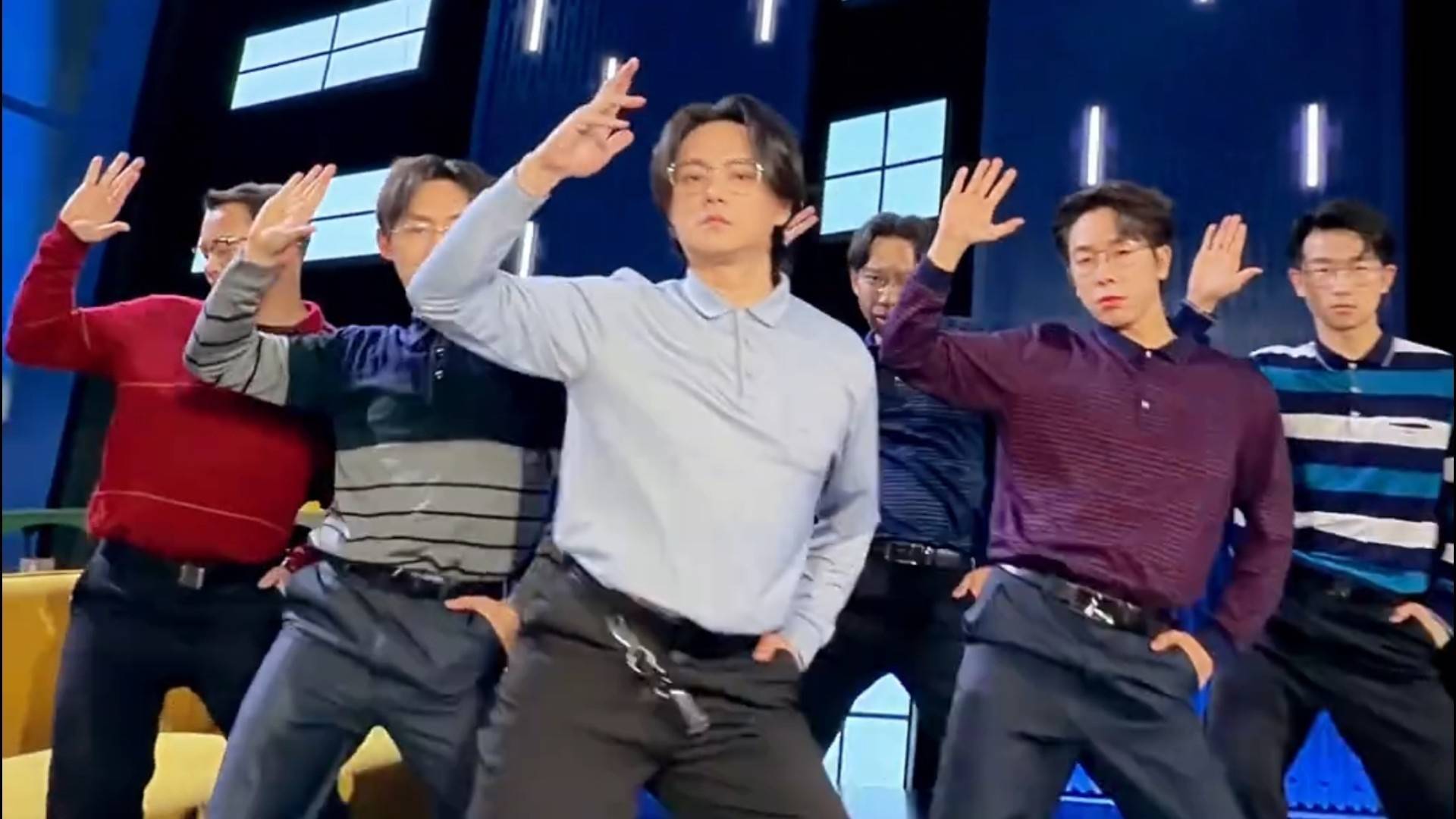 这次舞台最绝的是尹正的“反差感美学”。他特意梳了油亮的大背头,戴金丝边眼镜,上身是的确良白衬衫,下身搭配高腰喇叭裤,活脱脱从80年代挂历里走出来的“老干部”。可音乐一响,他身体像装了弹簧似的,胯部扭得比不齐舞团的小伙子们还带劲,尤其是那个双手交叉胸前、脑袋左右摇摆的标志性动作,严肃表情配上灵活身段,弹幕瞬间被“一本正经地发疯”“建议查精神状态”刷屏。有网友截出他跳舞时的眼神特写:“这表情像是在参加重要会议,肢体却在开派对,建议改名叫‘分裂摇’。”